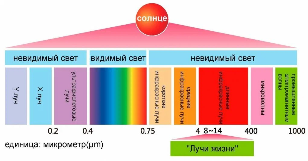 Солнце является источником видимого и невидимого света, одни лучи полезны для человека, но есть и лучи, которые могут быть вредными. Все они имеют разную длину волны. Для нас полезными являются длинноволновые инфракрасные (ДИК) «Лучи жизни» в диапазоне 8-14 мкм. Другие частоты лучей нам не подходят.