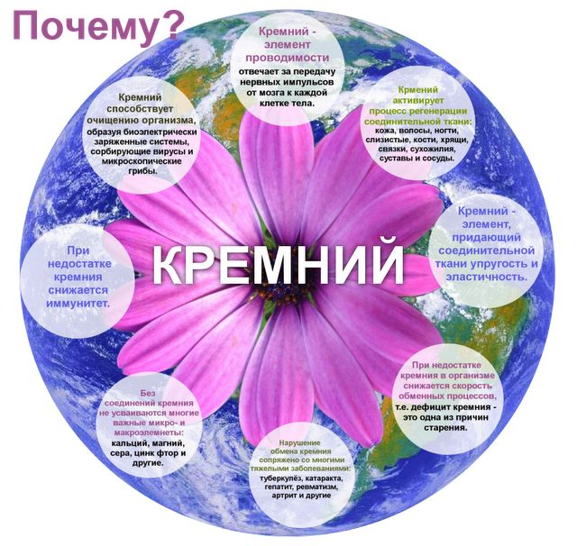 Учеными подсчитано – около 38% здоровья человека обеспечивается за счет кремния. Без этого элемента невозможно полноценное усвоение более 70 минеральных солей и многих витаминов. С недостатком кремния связывают развитие диабета, атеросклероза, болезни суставов, остеопороз, анемии, старческое слабоумие. Практически все болезни кожи, волос и ногтей также говорят о дефиците минерала.